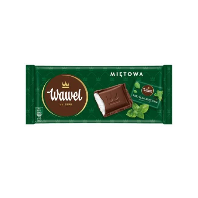 Czekolada Miętowa Wawel to połączenie aromatycznej, rozpływającej się w ustach czekolady deserowej oraz orzeźwiającego nadzienia o smaku mięty (50% masy produktu), które znane jest doskonale wszystkim miłośnikom słodkości z kultowych Pastylek Miętowych z Wawelu. Produkt zawiera naturalny olejek miętowy, jest bez emulgatora E476, substancji konserwujących i barwników. W składzie lecytyna z certyfikowanych nasion soi (bez GMO).