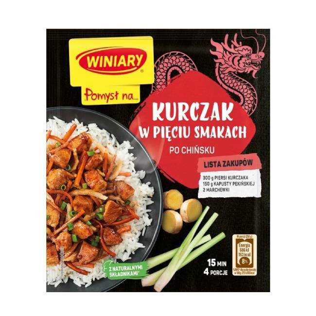 WINIARY Pomysł na… Kurczak w pięciu smakach to wygodna baza do domowego, orientalnego dania. Saszetka zawiera mieszankę przypraw oraz sos sojowy w proszku, dzięki czemu potrawa zyskuje wyrazisty smak i aromat bez potrzeby kompletowania wielu dodatków. Produkt świetnie pasuje do kurczaka i warzyw (np. papryka, marchew, cebula), a gotowe danie można podawać z ryżem lub makaronem. To praktyczne rozwiązanie, gdy chcesz szybko przygotować obiad: podsmaż mięso i warzywa, wymieszaj zawartość saszetki z wodą, wlej na patelnię i chwilę podgrzej do uzyskania sosu.