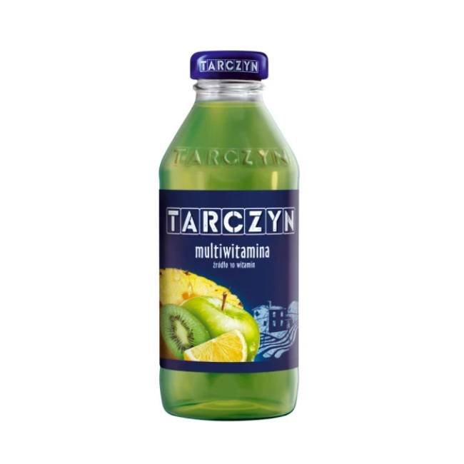 Tarczyn Napój Multiwitamina z zielonych owoców 300 ml to owocowy napój niegazowany w poręcznej szklanej butelce. Łączy delikatny smak jabłka z nutami cytryny, ananasa i kiwi, a dodatkowo został wzbogacony o 10 witamin.Tarczyn Napój Multiwitamina z zielonych owoców 300 ml to pasteryzowany napój wieloowocowy, który dobrze sprawdza się jako codzienny napój do posiłku, do pracy, szkoły lub na wynos. Receptura opiera się na wodzie oraz soku jabłkowym z dodatkiem soków z cytryny, ananasa i kiwi, dzięki czemu napój ma lekki, świeży i owocowy smak. Produkt został wzbogacony o 10 witamin, co dodatkowo podkreśla jego multiwitaminowy charakter. Mała szklana butelka jest wygodna w użyciu i dobrze sprawdza się poza domem.