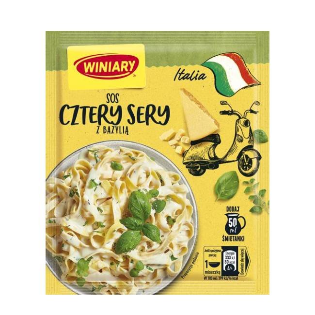Winiary Italia Sos 4 Sery z bazylią to aromatyczna mieszanka w proszku, która pozwala w kilka minut przygotować kremowy sos serowy inspirowany kuchnią włoską.
